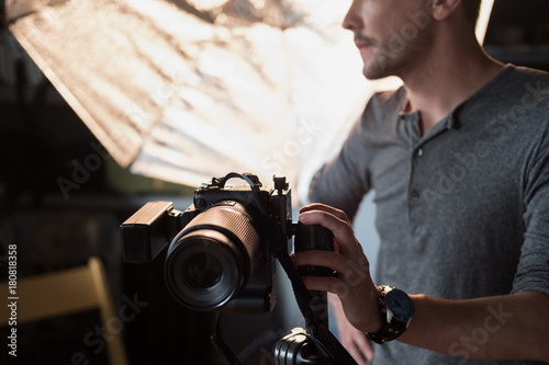© warloka79, Obraz premium closeup of the camera on the background lighting and the photographer
