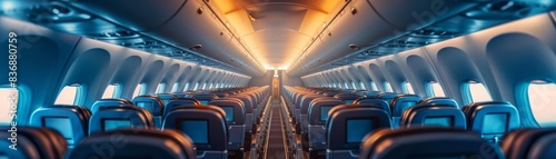 © ParinApril, Fototapeta premium Closeup of the empty seats and aisle of a commercial airliner, emphasizing the quiet and solitude of early morning flights