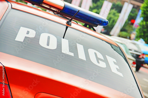 © macau, Obraz premium Closeup of the orange police car with a sign POLICE