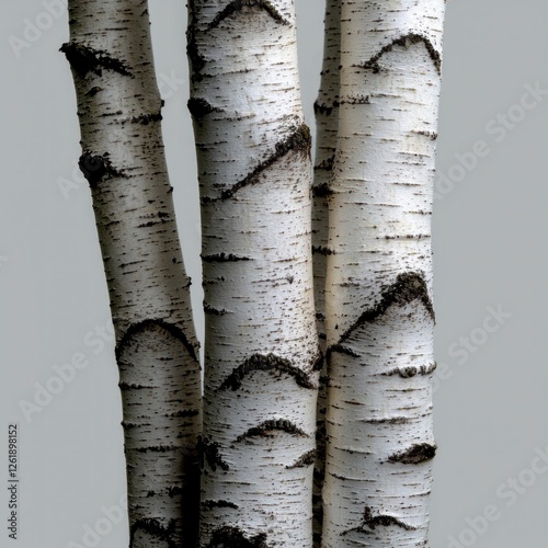 © BOJOShop, Fototapeta premium Closeup of Three Birch Tree Trunks Against Gray Background
