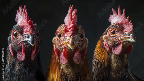 © Infinity Lens, Fototapeta premium Closeup of three chicken with different colours (dark brown, black and brown) looking into the camera.