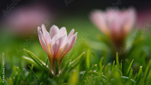 © MDMAHEDI, Fototapeta premium Closeup of Tiny Flower Growing in Fresh Green Grass with Blurred Background. Generative Ai