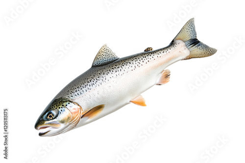 © boule1301, Naklejka premium Closeup of trout fish with spotted scales, fins and open mouth isolated on white transparent background, concept of wildlife