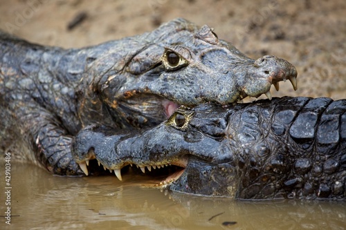 Obraz premium Closeup of two Black Caiman (Melanosuchus niger) fighting jaws locked Pampas...