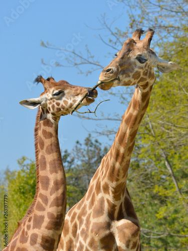 © Christian Musat, Fototapeta premium Closeup of two giraffes (Giraffa camelopardalis) with a twig