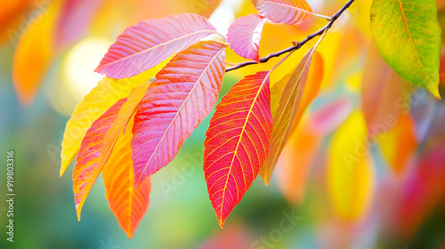 Fototapeta premium Closeup of vibrant leaves on a tree, capturing the essence of seasonal change