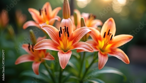 © miss irine, Naklejka premium Closeup of vibrant orange lily flowers in a garden. Delicate petals unfurl revealing yellow centers and black stamens. Soft sunlight illuminates the blooming plants, creating a natural, serene scene.