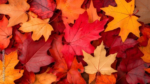 © NKCoolper, Fototapeta premium Closeup of Vibrant Red and Orange Autumn Leaves Scattered on the Ground Capturing the Essence of Fall Beauty and Nature s Seasonal Transition