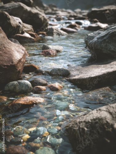 © Johannes, Fototapeta premium Closeup of water flow over smooth rocks in a tranquil river stream