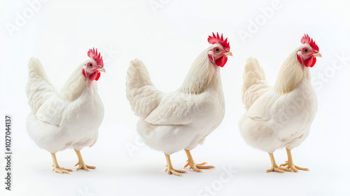 Fototapeta premium Closeup of white chickens in vibrant barnyard setting with ample copy space
