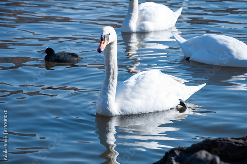 © tadeas, Naklejka premium Closeup of white swans on the river