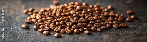 © Thanaseth, Naklejka premium Closeup of whole coffee beans scattered on a dark background, highlighting their natural beauty and rich brown shades