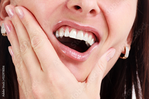 © Nobilior, Obraz premium Closeup of woman in strong toothache pain with hands over face. Dental health and care concept.