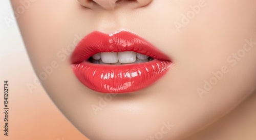 © Shahanara, Fototapeta premium Closeup of woman s lips with glossy coral lipstick