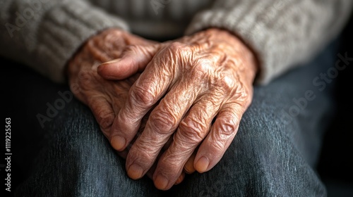 Fototapeta premium Closeup of Wrinkled Hands Resting on Denim Fabric