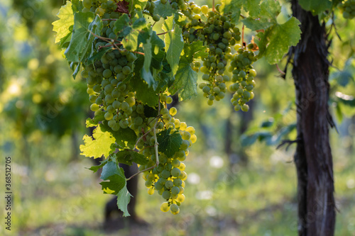 Fototapeta premium Closeup of yellow almost ripe grape in the European vineyard.