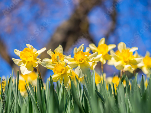 © penkanya, Fototapeta premium Closeup of yellow daffodil flower with blurry blue sky background in the park or garden.