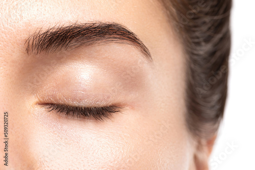 © blackday, Obraz premium Closeup of young female eye without makeup