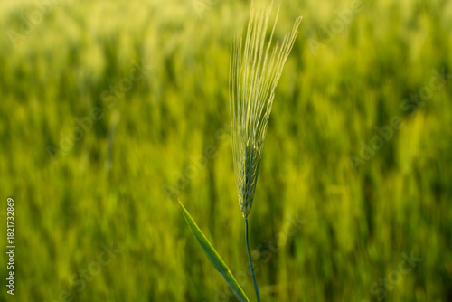 Naklejka premium Closeup of young green barley head on blurred background, spring growth concept with natural light and soft focus