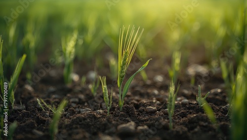 Fototapeta premium Closeup of young wheat sprouts, showcasing growth potential, Earth Day