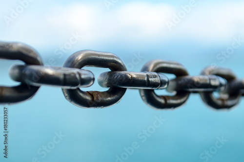 © ruzella, Fototapeta premium Closeup Old Steel Link Chains with Ocean background.