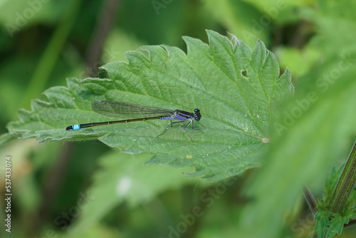 Naklejka premium Closeup on a blue-tailed damselfly, Ischnura elegans sitting on a green leaf