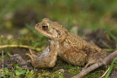 © Henk, Fototapeta premium Closeup on a common European toad, Bufu bofo in the garden against a green background