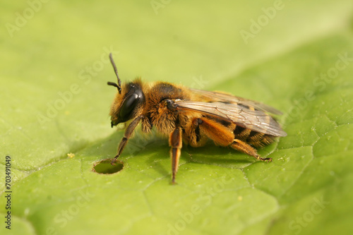 © Henk, Fototapeta premium Closeup on a female Yellow-legged mining bee, Andrena flavipes, sitting on a green leaf