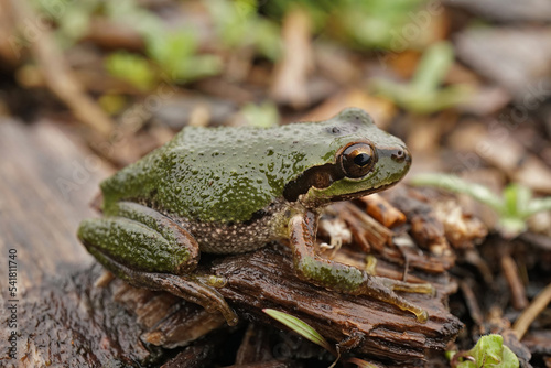 Fototapeta premium Closeup on a green Pacific treefrog, Pseudacris regilla in rainy clouded weather