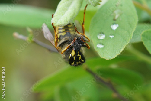 Fototapeta premium Closeup on a worker European yellow-jacket wasp, Vespula vulgaris preadting...
