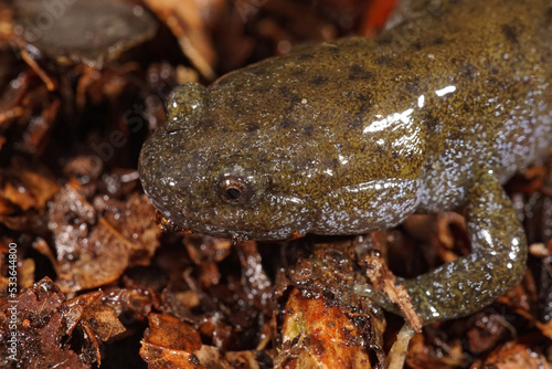 Naklejka premium Closeup on the head of the endangered Japanese Oita salamander, Hynobius dunni
