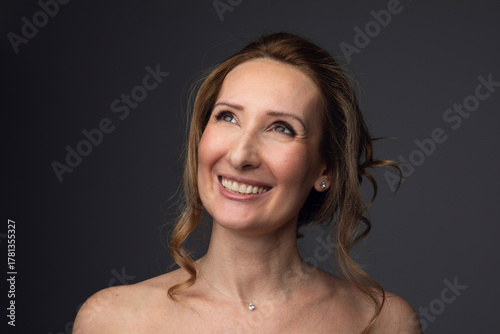© Corina, Obraz premium Closeup photo of a happy beautiful woman, looking at camera, holding a hands near neck, isolated grey background.