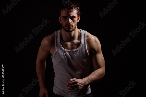 © alfa27, Fototapeta premium closeup photo of jogging man on the black background. going in for sport. motivation