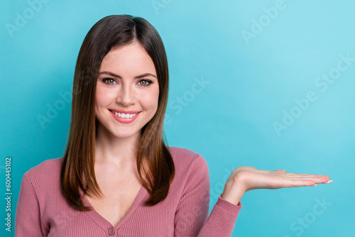 © deagreez, Fototapeta premium Closeup photo of young promoter brown hair girl hold arm presentation product discount offer shop isolated on aquamarine color background