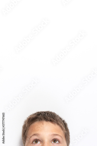 © vejaa, Obraz premium Closeup portrait headshot cropped face of boy looking up isolated on white background with copy space above head