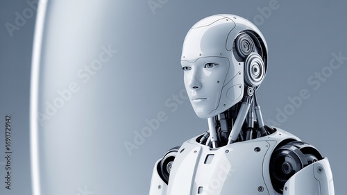© Mohsin, Naklejka premium Closeup portrait of a futuristic humanoid robot with intricate mechanical details and a neutral expression