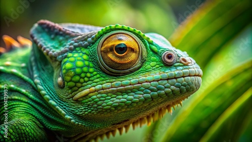 © Arnada, Fototapeta premium Closeup Portrait of a Green Chameleon - Vibrant Colors and Unique Features for Nature Photography