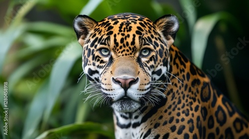 Obraz premium Closeup Portrait of a Jaguar in Lush Green Jungle
