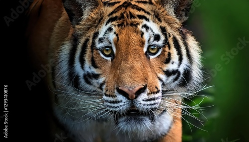 © netsay, Naklejka premium Closeup Portrait of a Sumatran Tiger Powerful Stare Echoes Majestic Wilderness, Vivid Green Fur Glows in Jungles Dappled Light, Embracing the Primeval Beauty of Endangered Big Cat