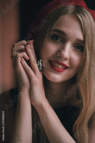 Obraz premium Closeup portrait of a young beautiful woman in beret