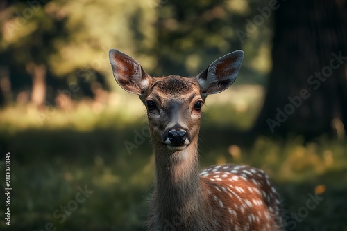 © atar, Fototapeta premium Closeup portrait of a young fawn in a forest with blurred background.