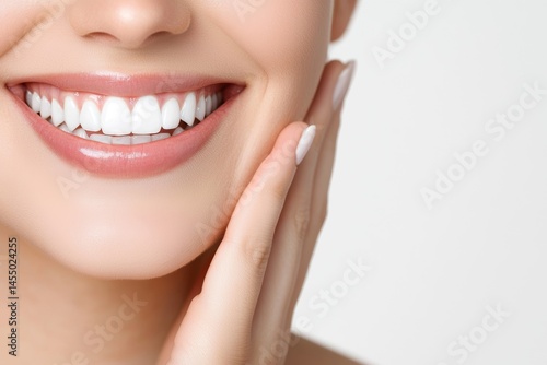 Fototapeta premium Closeup portrait of cheerful young woman smiling with bright white teeth on light background