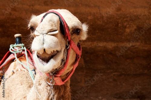 Obraz premium Closeup portrait of Dromedary camel with open mouth and red bridle tied to a...