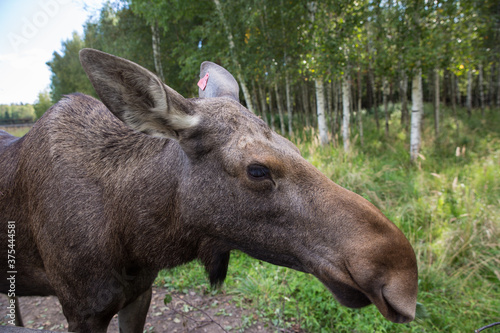 Fototapeta premium Closeup portrait of funny curious head of a moose or Eurasian elk with big...