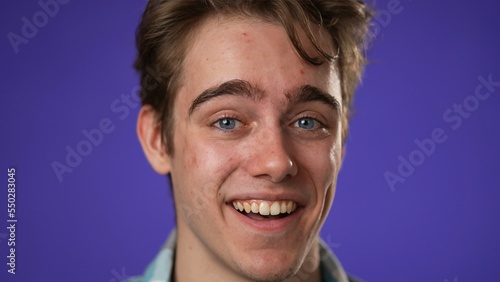 © Robert Peak, Fototapeta premium Closeup portrait of laughing smiling, happy, handsome young hipster man 20s isolated on purple color background in studio. Sincere emotions lifestyle concept.
