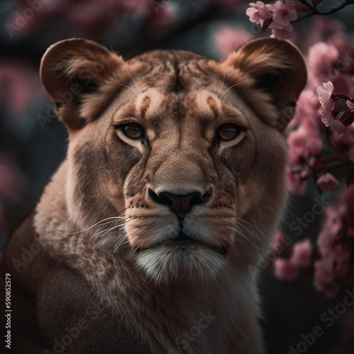 © DIGITAL, Fototapeta premium Closeup portrait of lion with cherry bloom flowers on background