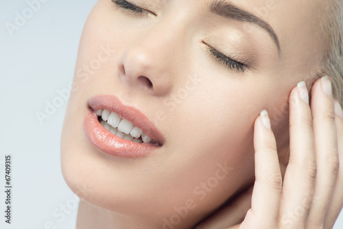 Fototapeta premium Closeup portrait of young beautiful green eyed woman touching he