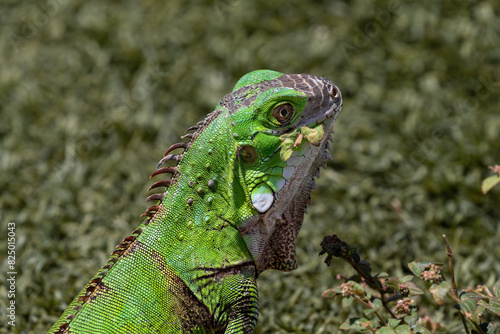 Fototapeta premium Closeup portrait of young green iguana (iguana iguana), facing camera. On the island of Aruba. Bright green scales, grass in background.