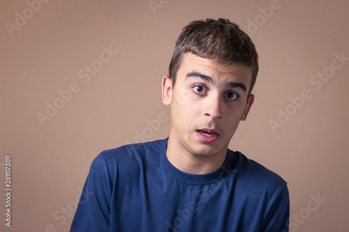 © stivog, Fototapeta premium Closeup portrait of young man feeling surprised, scared.