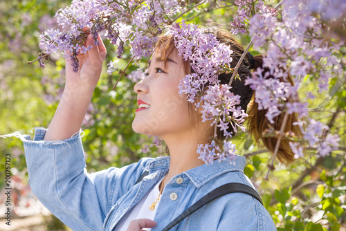 © ddukang, Obraz premium Closeup portrait of young woman enjoying spring nature, having fun outdoors.